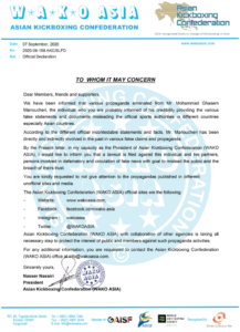 By the Present letter, in my capacity as the President of Asian Kickboxing Confederation (WAKO ASIA), I would like to inform you that a lawsuit is filed against this individual and his partners, persons involved in defamatory and circulation of fake news with goal to mislead the public and the breach of theirs trust.