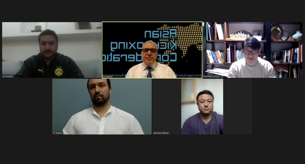 The meeting was chaired by President Nassiri, with Participation of Euncheon Jeong Ph.D the Chairman of Technical committee and executive member of the Board, Mr. Ali Ramadan the member of the organizing committee and executive member of the Board, Mr Daniel Obon Executive member of the Board and Treasure, Mr Suleiman Maloer the member of solidarity and sport for all of Asian Confederation and Vice President of Kyrgystan Kickboxing Federation. Mr Aleksandr Voinov the Vice President of Confederation was following the meeting through Mr Suleiman Maloer translation facilities.
